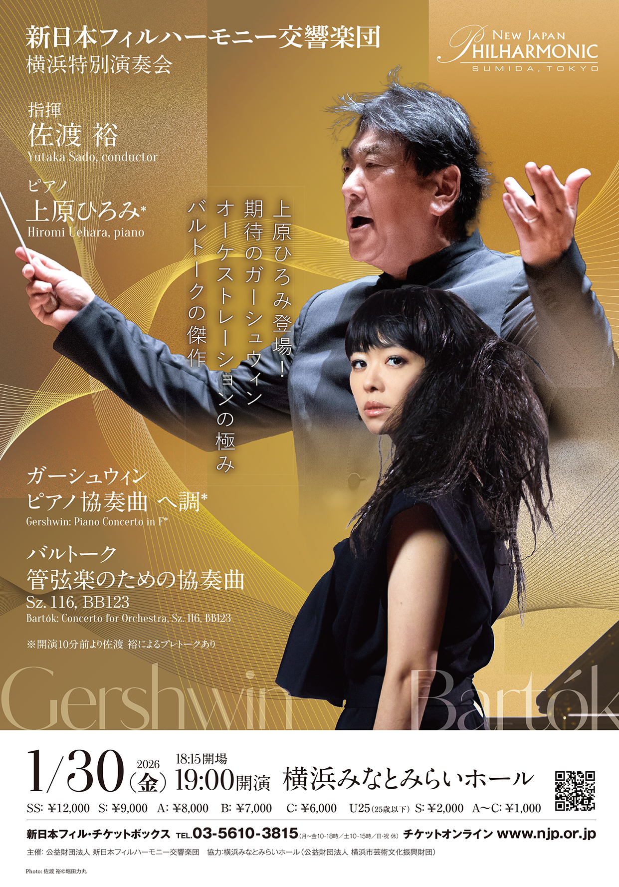 世界中からラブコールが止まらないピアニスト・上原ひろみ。「上原ひろみ ザ・ピアノ・クインテット」名義での西江辰郎(NJPコンサートマスター)、ビルマン聡平(NJP首席第2ヴァイオリン奏者)とのユニット活動も人気を博していますが、佐渡裕とは初共演。ガーシュウィンのピアノ協奏曲で魅了します。後半は、「楽団員の自主的なアンサンブル力を引き出し、その音楽性の高さをお客様にお楽しみいただきたい」と語る佐渡裕のタクトによる「バルトーク管弦楽のための協奏曲」をお届けします。