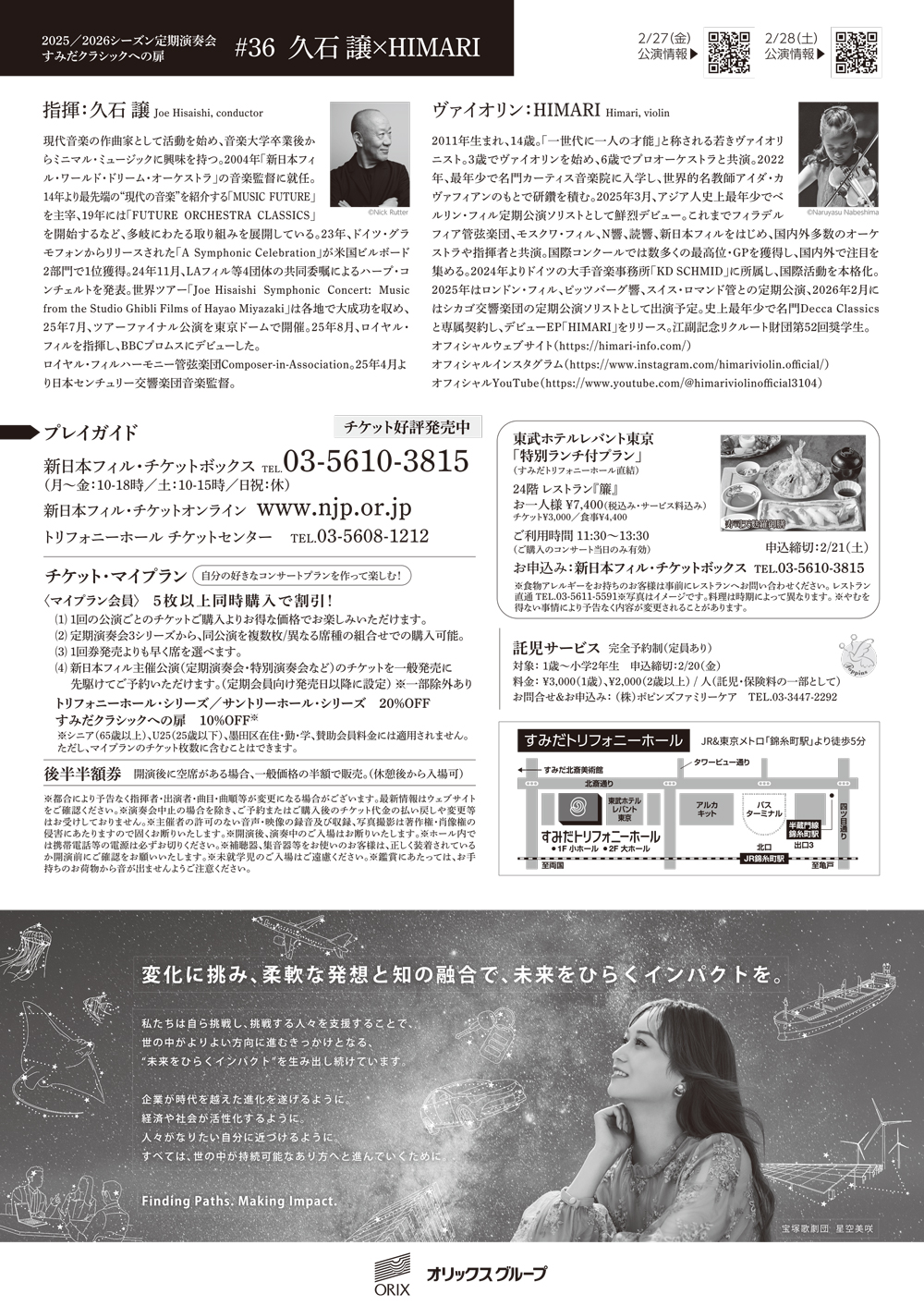 *Sumida Ward Resident/Work Discount: Available only at the New Japan Philharmonic Ticket Box & Triphony Hall Ticket Center